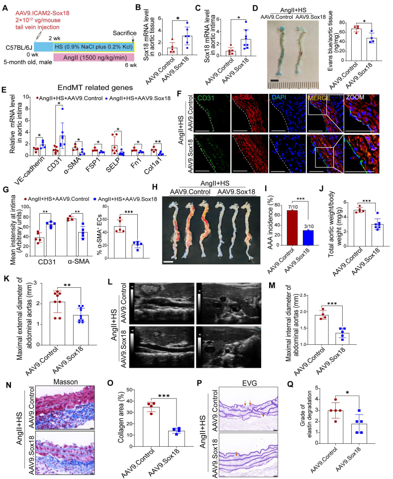 研究人员鉴定了在AAA中控制EC表型和EndMT的关键转录因子,发现Sox18的表达差异最为显著。生物信息学分析显示,在多种AAA模型中,Sox18均一致下调,并通过实验证实了Sox18在AngII+HS诱导的AAA小鼠主动脉ECs以及人类AAA样本中的下调。基于这些发现,研究人员提出Sox18下调可能启动AAA中的EndMT。通过Sox18敲低实验证实了Sox18在维持正常EC表型中不可或缺的作用。机制研究表明Sox18沉默通过激活PI3K/Akt信号通路促进EndMT。为了进一步研究Sox18在EndMT和AAA发病机制中的作用,将内皮特异性AAV9-ICAM2-Sox18注射到小鼠体内,并成功在小鼠主动脉内膜过表达Sox18。伊文思蓝渗透性分析表明,与对照组相比,过表达Sox18显著改善了内皮屏障的完整性。Sox18过表达显著上调了主动脉内膜内皮细胞标志基因,下调了间充质标志基因。CD31+α-SMA+细胞百分率的下降进一步证实了Sox18对EndMT的抑制作用,Sox18过表达显著减少了AngII+HS诱导的AAA形成。以上结果证明了Sox18在体内对EndMT和AAA的形成具有保护作用。